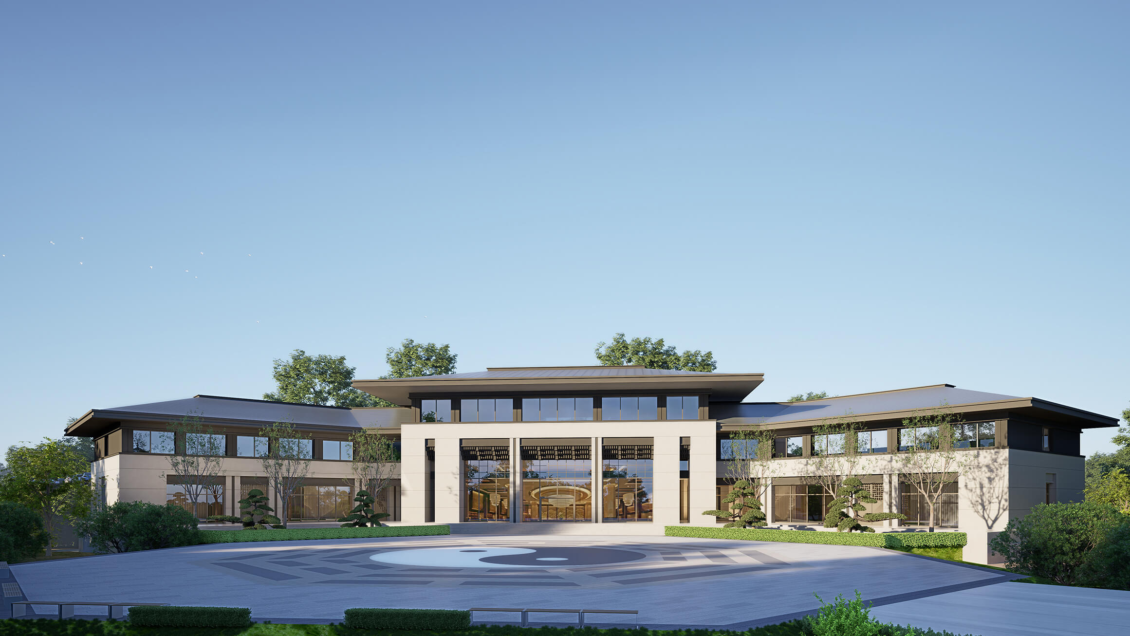 园区内的美学表达不仅依托自然,更依托文化。石材肌理、线条比例、色彩序列与绿化景观之间相互呼应,构建出一幅幅“可行、可望、可居、可游”的东方山水意境。无论春来松影斜落,夏临松涛清风,秋赏层林染色,冬观山水幽静,皆能体验到生活之外的一份宁静与厚重。